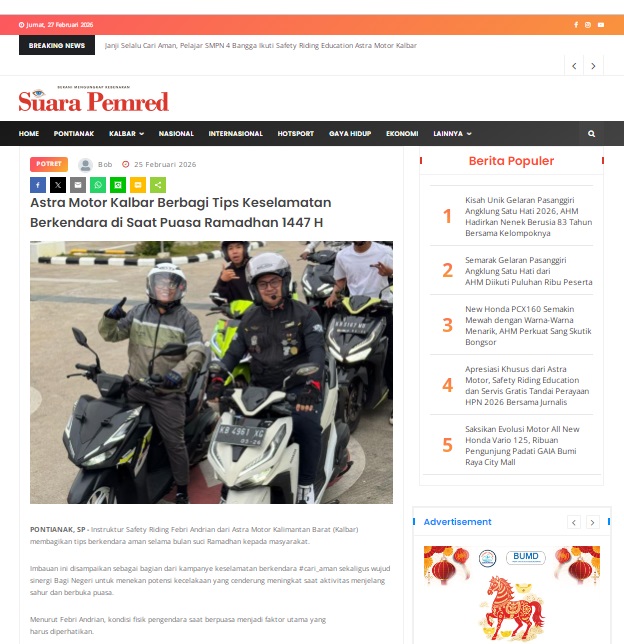 Astra Motor Kalbar Berbagi Tips Keselamatan Berkendara di Saat Puasa Ramadhan 1447 H by masmul 25 Februari 2026 in Silahkan kunjungi https://www.suarapemredkalbar.com/read/potret/25022026/astra-motor-kalbar-berbagi-tips-keselamatan-berkendara-di-saat-puasa-ramadhan-1447-h. You Might Like Regional Public Launching New ADV160 The SUV Pride Grand Launching New PCX 160 Truly Exceptional! Tetap hati-hati ya bro sist berkendara saat hujan.