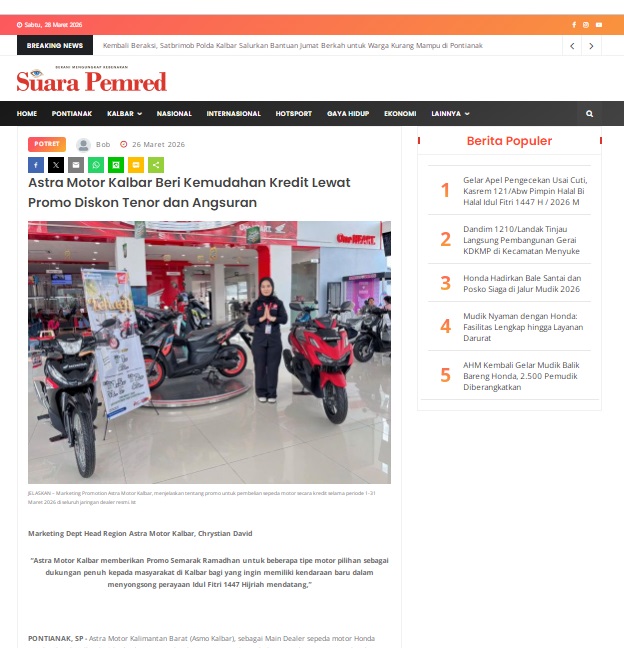 Astra Motor Kalbar Beri Kemudahan Kredit Lewat Promo Diskon Tenor dan Angsuran by masmul 26 Maret 2026 in Silahkan kunjungi https://www.suarapemredkalbar.com/read/potret/26032026/astra-motor-kalbar-beri-kemudahan-kredit-lewat-promo-diskon-tenor-dan-angsuran. You Might Like Regional Public Launching New ADV160 The SUV Pride Grand Launching New PCX 160 Truly Exceptional! Tetap hati-hati ya bro sist berkendara saat hujan.