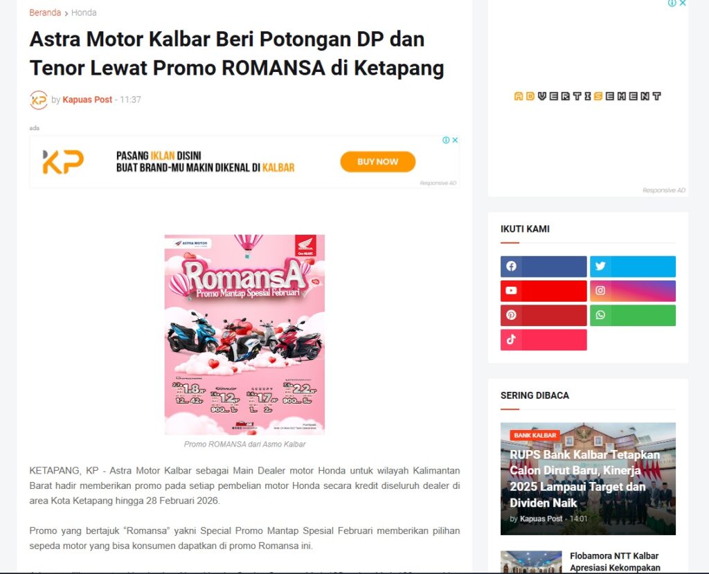Astra Motor Kalbar Beri Potongan DP dan Tenor Lewat Promo ROMANSA di Ketapang by Muhammad Arif 15 Februari 2026 in Silahkan kunjungi https://www.kapuaspost.web.id/2026/02/astra-motor-kalbar-beri-potongan-dp-dan.html. Tags: astra Astra Motor kalbar Astra Motor Pontianak astramotor honda kalbar pontianak sepeda motor You Might Like Regional Public Launching New ADV160 The SUV Pride Grand Launching New PCX 160 Truly Exceptional! Tetap hati-hati ya bro sist berkendara saat hujan.