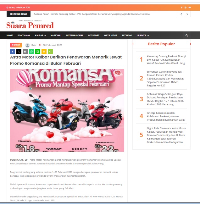 Astra Motor Kalbar Berikan Penawaran Menarik Lewat Promo Romansa di Bulan Februari by masmul 8 Februari 2026 in Silahkan kunjungi https://www.suarapemredkalbar.com/read/potret/08022026/astra-motor-kalbar-berikan-penawaran-menarik-lewat-promo-romansa-di-bulan-februari. You Might Like Regional Public Launching New ADV160 The SUV Pride Grand Launching New PCX 160 Truly Exceptional! Tetap hati-hati ya bro sist berkendara saat hujan.