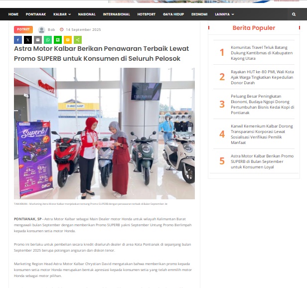 Astra Motor Kalbar Berikan Penawaran Terbaik Lewat Promo SUPERB untuk Konsumen di Seluruh Pelosok by masmul 14 September 2025 in Silahkan kunjungi https://www.suarapemredkalbar.com/read/potret/14092025/astra-motor-kalbar-berikan-penawaran-terbaik-lewat-promo-superb-untuk-konsumen-di-seluruh-pelosok. You Might Like Regional Public Launching New ADV160 The SUV Pride Grand Launching New PCX 160 Truly Exceptional! Tetap hati-hati ya bro sist berkendara saat hujan.