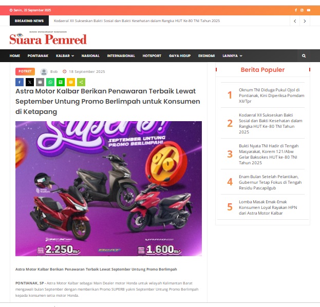 Astra Motor Kalbar Berikan Penawaran Terbaik Lewat September Untung Promo Berlimpah untuk Konsumen di Ketapang by masmul 18 September 2025 in Silahkan kunjungi https://www.suarapemredkalbar.com/read/potret/18092025/astra-motor-kalbar-berikan-penawaran-terbaik-lewat-september-untung-promo-berlimpah-untuk-konsumen-di-ketapang. You Might Like Regional Public Launching New ADV160 The SUV Pride Grand Launching New PCX 160 Truly Exceptional! Tetap hati-hati ya bro sist berkendara saat hujan.