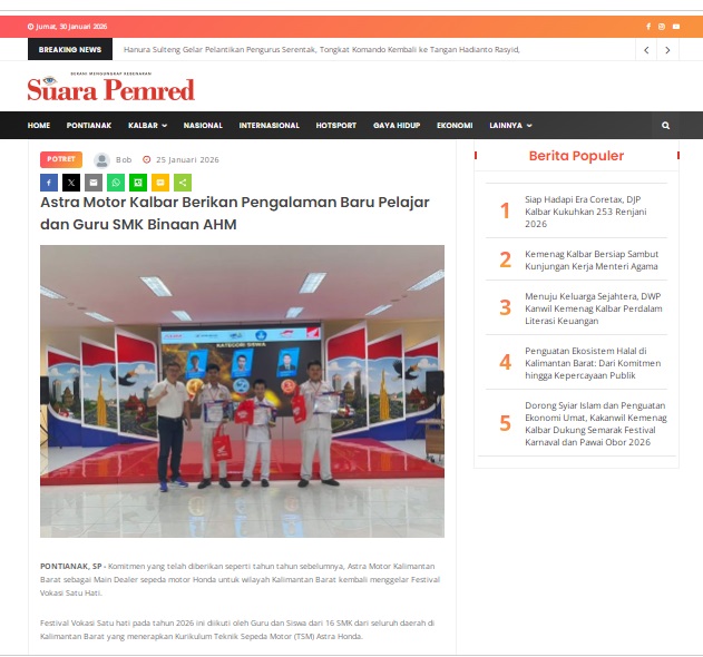 Astra Motor Kalbar Berikan Pengalaman Baru Pelajar dan Guru SMK Binaan AHM by masmul 25 Januari 2026 in Silahkan kunjungi https://www.suarapemredkalbar.com/read/potret/25012026/astra-motor-kalbar-berikan-pengalaman-baru-pelajar-dan-guru-smk-binaan-ahm. You Might Like Regional Public Launching New ADV160 The SUV Pride Grand Launching New PCX 160 Truly Exceptional! Tetap hati-hati ya bro sist berkendara saat hujan.