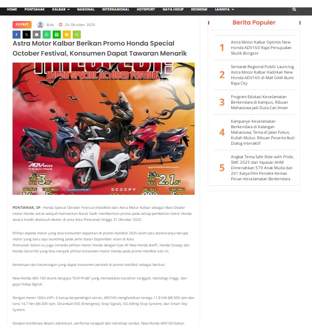 Astra Motor Kalbar Berikan Promo Honda Special October Festival, Konsumen Dapat Tawaran Menarik by masmul 25 Oktober 2025 in Silahkan kunjungi https://www.suarapemredkalbar.com/read/potret/25102025/astra-motor-kalbar-berikan-promo-honda-special-october-festival-konsumen-dapat-tawaran-menarik. You Might Like Regional Public Launching New ADV160 The SUV Pride Grand Launching New PCX 160 Truly Exceptional! Tetap hati-hati ya bro sist berkendara saat hujan.