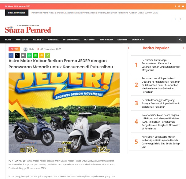 Astra Motor Kalbar Berikan Promo JEDER dengan Penawaran Menarik untuk Konsumen di Putussibau by masmul 9 November 2025 in Silahkan kunjungi https://www.suarapemredkalbar.com/read/potret/09112025/astra-motor-kalbar-berikan-promo-jeder-dengan-penawaran-menarik-untuk-konsumen-di-putussibau. You Might Like Regional Public Launching New ADV160 The SUV Pride Grand Launching New PCX 160 Truly Exceptional! Tetap hati-hati ya bro sist berkendara saat hujan.