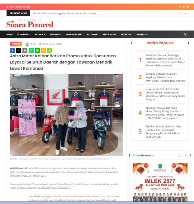Astra Motor Kalbar Berikan Promo untuk Konsumen Loyal di Seluruh Daerah dengan Tawaran Menarik Lewat Romansa by masmul 21 Februari 2026 in Silahkan kunjungi https://www.suarapemredkalbar.com/read/potret/21022026/astra-motor-kalbar-berikan-promo-untuk-konsumen-loyal-di-seluruh-daerah-dengan-tawaran-menarik-lewat-romansa. You Might Like Regional Public Launching New ADV160 The SUV Pride Grand Launching New PCX 160 Truly Exceptional! Tetap hati-hati ya bro sist berkendara saat hujan.