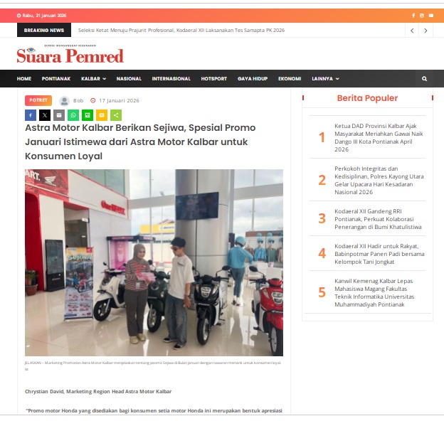 Astra Motor Kalbar Berikan Sejiwa, Spesial Promo Januari Istimewa dari Astra Motor Kalbar untuk Konsumen Loyal by masmul 17 Januari 2026 in Silahkan kunjungi https://www.suarapemredkalbar.com/read/potret/17012026/astra-motor-kalbar-berikan-sejiwa-spesial-promo-januari-istimewa-dari-astra-motor-kalbar-untuk-konsumen-loyal. You Might Like Regional Public Launching New ADV160 The SUV Pride Grand Launching New PCX 160 Truly Exceptional! Tetap hati-hati ya bro sist berkendara saat hujan.