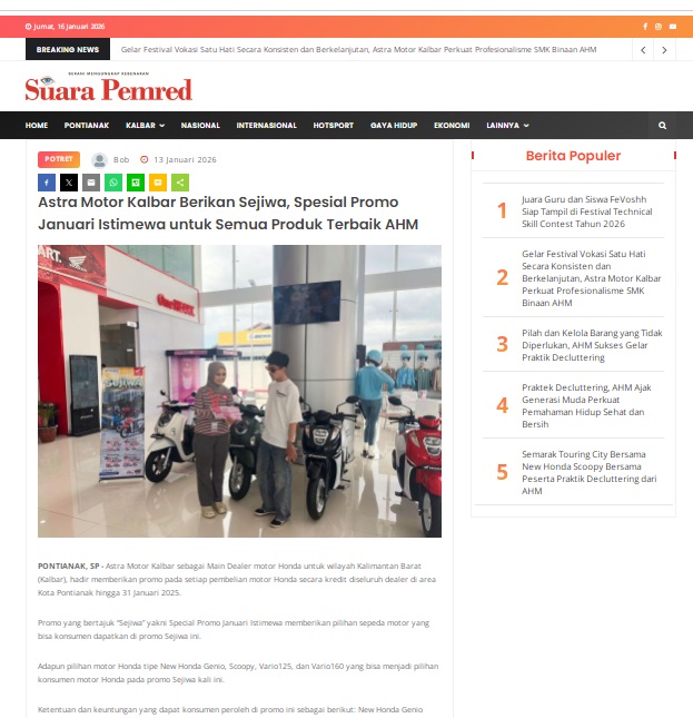 Astra Motor Kalbar Berikan Sejiwa, Spesial Promo Januari Istimewa untuk Semua Produk Terbaik AHM by masmul 13 Januari 2026 in Silahkan kunjungi https://www.suarapemredkalbar.com/read/potret/13012026/astra-motor-kalbar-berikan-sejiwa-spesial-promo-januari-istimewa-untuk-semua-produk-terbaik-ahm. You Might Like Regional Public Launching New ADV160 The SUV Pride Grand Launching New PCX 160 Truly Exceptional! Tetap hati-hati ya bro sist berkendara saat hujan.