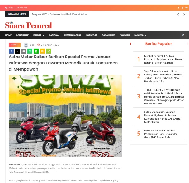 Astra Motor Kalbar Berikan Special Promo Januari Istimewa dengan Tawaran Menarik untuk Konsumen di Mempawah by masmul 21 Januari 2026 in Silahkan kunjungi https://www.suarapemredkalbar.com/read/potret/21012026/astra-motor-kalbar-berikan-special-promo-januari-istimewa-dengan-tawaran-menarik-untuk-konsumen-di-mempawah. You Might Like Regional Public Launching New ADV160 The SUV Pride Grand Launching New PCX 160 Truly Exceptional! Tetap hati-hati ya bro sist berkendara saat hujan.