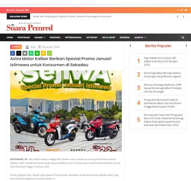 Astra Motor Kalbar Berikan Spesial Promo Januari Istimewa untuk Konsumen di Sekadau by masmul 30 Januari 2026 in Silahkan kunjungi https://www.suarapemredkalbar.com/read/potret/30012026/astra-motor-kalbar-berikan-spesial-promo-januari-istimewa-untuk-konsumen-di-sekadau. You Might Like Regional Public Launching New ADV160 The SUV Pride Grand Launching New PCX 160 Truly Exceptional! Tetap hati-hati ya bro sist berkendara saat hujan.
