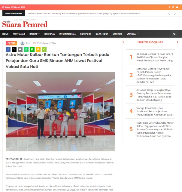 Astra Motor Kalbar Berikan Tantangan Terbaik pada Pelajar dan Guru SMK Binaan AHM Lewat Festival Vokasi Satu Hati by masmul 9 Februari 2026 in Silahkan kunjungi https://www.suarapemredkalbar.com/read/potret/09022026/astra-motor-kalbar-berikan-tantangan-terbaik-pada-pelajar-dan-guru-smk-binaan-ahmlewat-festival-vokasi-satu-hati. You Might Like Regional Public Launching New ADV160 The SUV Pride Grand Launching New PCX 160 Truly Exceptional! Tetap hati-hati ya bro sist berkendara saat hujan.