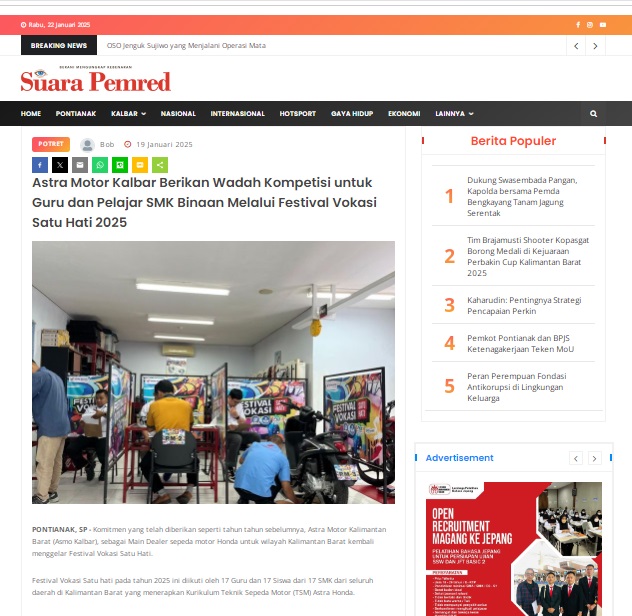 Astra Motor Kalbar Berikan Wadah Kompetisi untuk Guru dan Pelajar SMK Binaan Melalui Festival Vokasi Satu Hati 2025 by masmul 19 Januari 2025 in Silahkan kunjungi https://www.suarapemredkalbar.com/read/potret/19012025/astra-motor-kalbar-berikan-wadah-kompetisi-untuk-guru-dan-pelajar-smk-binaan-melalui-festival-vokasi-satu-hati-2025. You Might Like Regional Public Launching New ADV160 The SUV Pride Grand Launching New PCX 160 Truly Exceptional! Tetap hati-hati ya bro sist berkendara saat hujan.