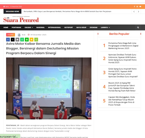 Astra Motor Kalbar Bersama Jurnalis Media dan Blogger, Bersinergi dalam Decluttering Mission Program Berpacu Dalam Sinergi by masmul 9 Desember 2025 in Silahkan kunjungi https://www.suarapemredkalbar.com/read/potret/09122025/astra-motor-kalbar-bersama-jurnalis-media-dan-blogger-bersinergi-dalam-decluttering-mission-program-berpacu-dalam-sinergi. You Might Like Regional Public Launching New ADV160 The SUV Pride Grand Launching New PCX 160 Truly Exceptional! Tetap hati-hati ya bro sist berkendara saat hujan.