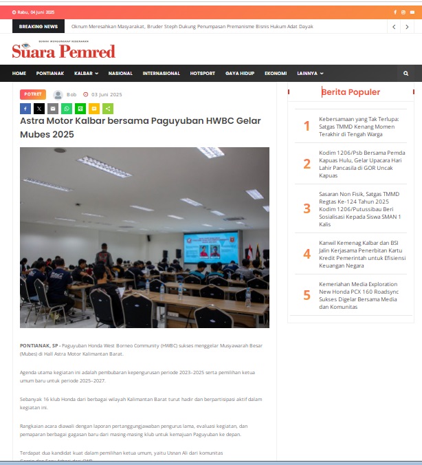 Astra Motor Kalbar bersama Paguyuban HWBC Gelar Mubes 2025 by masmul 3 Juni 2025 in Silahkan kunjungi https://www.suarapemredkalbar.com/read/potret/03062025/astra-motor-kalbar-bersama-paguyuban-hwbc-gelar-mubes-2025. You Might Like Regional Public Launching New ADV160 The SUV Pride Grand Launching New PCX 160 Truly Exceptional! Tetap hati-hati ya bro sist berkendara saat hujan.