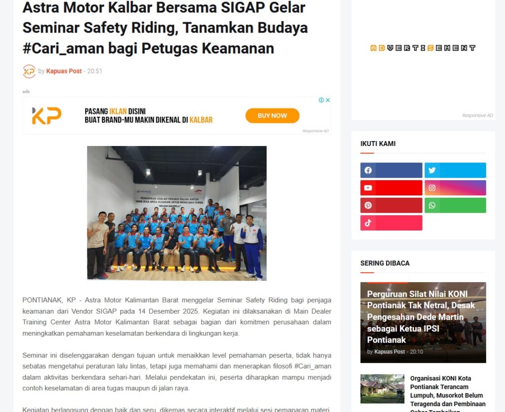 Astra Motor Kalbar Bersama SIGAP Gelar Seminar Safety Riding, Tanamkan Budaya #Cari_aman bagi Petugas Keamanan by Muhammad Arif 20 Desember 2025 in Silahkan kunjungi https://www.kapuaspost.web.id/2025/12/astra-motor-kalbar-bersama-sigap-gelar.html. Tags: astra Astra Motor kalbar Astra Motor Pontianak astramotor honda kalbar pontianak sepeda motor You Might Like Regional Public Launching New ADV160 The SUV Pride Grand Launching New PCX 160 Truly Exceptional! Tetap hati-hati ya bro sist berkendara saat hujan.