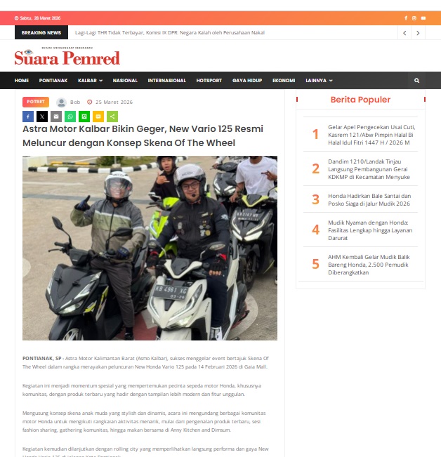 Astra Motor Kalbar Bikin Geger, New Vario 125 Resmi Meluncur dengan Konsep Skena Of The Wheel by masmul 25 Maret 2026 in Silahkan kunjungi https://www.suarapemredkalbar.com/read/potret/25032026/astra-motor-kalbar-bikin-geger-new-vario-125-resmi-meluncur-dengan-konsep-skena-of-the-wheel. You Might Like Regional Public Launching New ADV160 The SUV Pride Grand Launching New PCX 160 Truly Exceptional! Tetap hati-hati ya bro sist berkendara saat hujan.