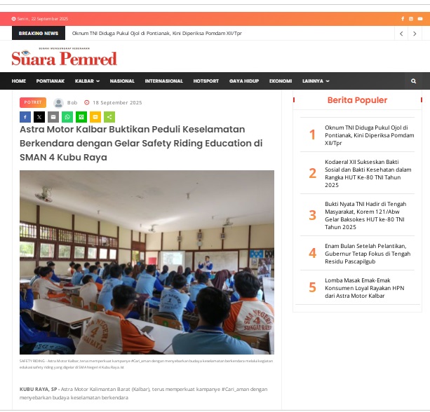 Astra Motor Kalbar Buktikan Peduli Keselamatan Berkendara dengan Gelar Safety Riding Education di SMAN 4 Kubu Raya by masmul 18 September 2025 in Silahkan kunjungi https://www.suarapemredkalbar.com/read/potret/18092025/astra-motor-kalbar-buktikan-peduli-keselamatan-berkendara-dengan-gelar-safety-riding-education-di-sman-4-kubu-raya. You Might Like Regional Public Launching New ADV160 The SUV Pride Grand Launching New PCX 160 Truly Exceptional! Tetap hati-hati ya bro sist berkendara saat hujan.