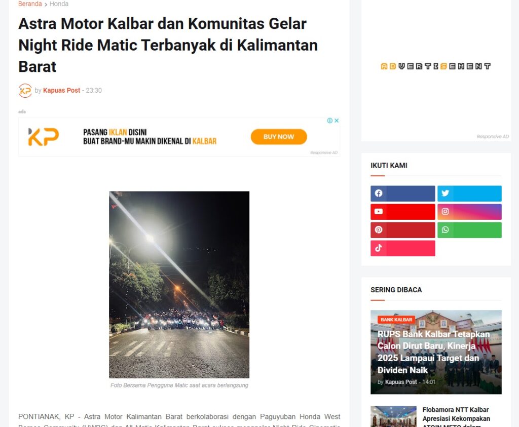 Astra Motor Kalbar dan Komunitas Gelar Night Ride Matic Terbanyak di Kalimantan Barat by Muhammad Arif 13 Februari 2026 in Silahkan kunjungi https://www.kapuaspost.web.id/2026/02/astra-motor-kalbar-dan-komunitas-gelar.html. Tags: astra Astra Motor kalbar Astra Motor Pontianak astramotor honda kalbar pontianak sepeda motor You Might Like Regional Public Launching New ADV160 The SUV Pride Grand Launching New PCX 160 Truly Exceptional! Tetap hati-hati ya bro sist berkendara saat hujan.