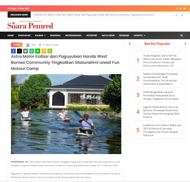 Astra Motor Kalbar dan Paguyuban Honda West Borneo Community Tingkatkan Silaturahmi Lewat Fun Motour Camp by masmul 27 Maret 2026 in Silahkan kunjungi https://www.suarapemredkalbar.com/read/potret/27032026/astra-motor-kalbar-dan-paguyuban-honda-west-borneo-community-tingkatkan-silaturahmi-lewat-fun-motour-camp. You Might Like Regional Public Launching New ADV160 The SUV Pride Grand Launching New PCX 160 Truly Exceptional! Tetap hati-hati ya bro sist berkendara saat hujan.