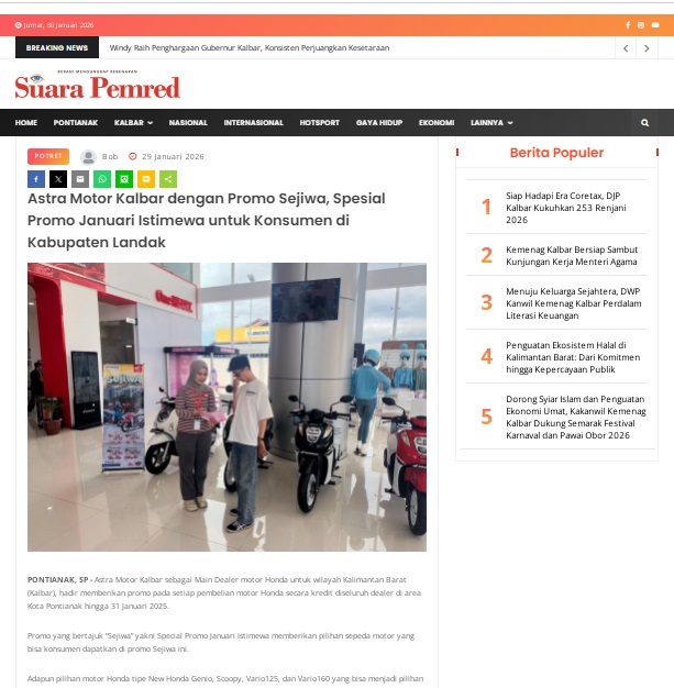 Astra Motor Kalbar dengan Promo Sejiwa, Spesial Promo Januari Istimewa untuk Konsumen di Kabupaten Landak by masmul 29 Januari 2026 in Silahkan kunjungi https://www.suarapemredkalbar.com/read/potret/29012026/astra-motor-kalbar-dengan-promo-sejiwa-spesial-promo-januari-istimewa-untuk-konsumen-di-kabupaten-landak. You Might Like Regional Public Launching New ADV160 The SUV Pride Grand Launching New PCX 160 Truly Exceptional! Tetap hati-hati ya bro sist berkendara saat hujan.