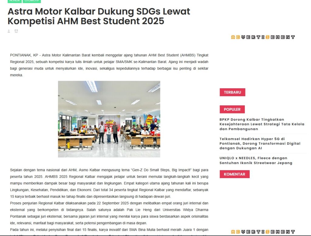 Astra Motor Kalbar Dukung SDGs Lewat Kompetisi AHM Best Student 2025 by Muhammad Arif 4 Oktober 2025 in Silahkan kunjungi https://www.kapuaspost.web.id/2025/10/astra-motor-kalbar-dukung-sdgs-lewat.html. Tags: astra Astra Motor kalbar Astra Motor Pontianak astramotor honda kalbar pontianak sepeda motor You Might Like Regional Public Launching New ADV160 The SUV Pride Grand Launching New PCX 160 Truly Exceptional! Tetap hati-hati ya bro sist berkendara saat hujan.