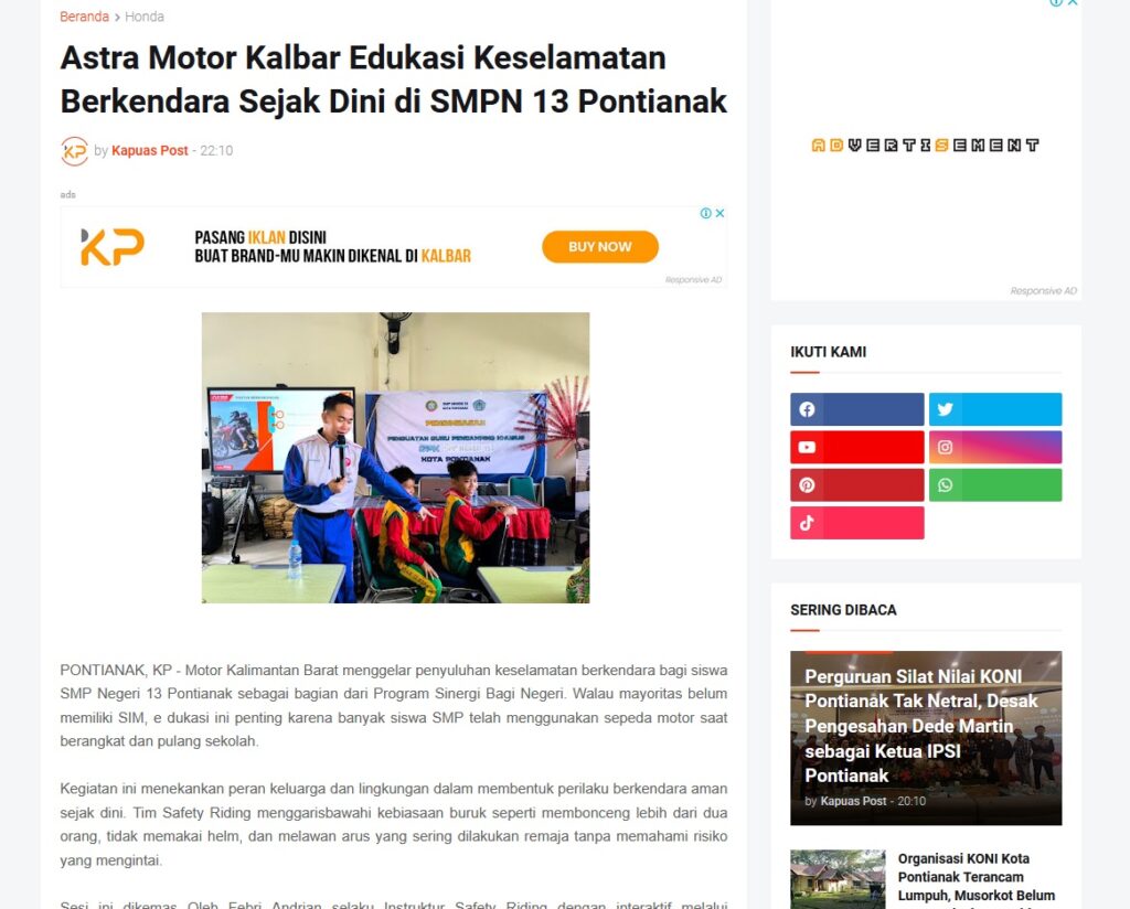 Astra Motor Kalbar Edukasi Keselamatan Berkendara Sejak Dini di SMPN 13 Pontianak by Muhammad Arif 17 Desember 2025 in Silahkan kunjungi https://www.kapuaspost.web.id/2025/12/astra-motor-kalbar-edukasi-keselamatan.html. Tags: astra Astra Motor kalbar Astra Motor Pontianak astramotor honda kalbar pontianak sepeda motor You Might Like Regional Public Launching New ADV160 The SUV Pride Grand Launching New PCX 160 Truly Exceptional! Tetap hati-hati ya bro sist berkendara saat hujan.