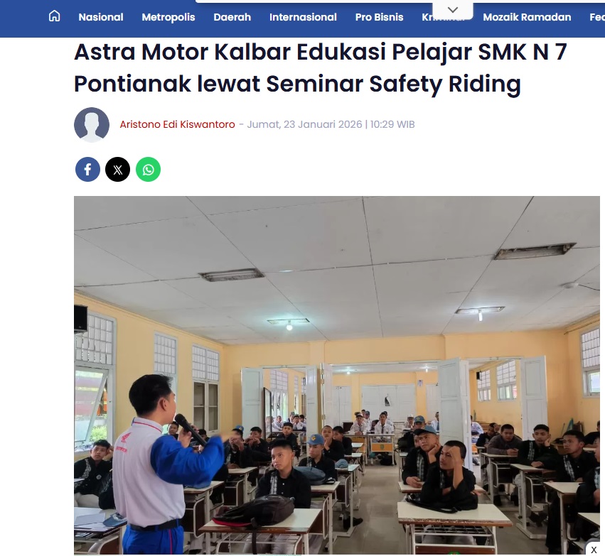 Astra Motor Kalbar Edukasi Pelajar SMK N 7 Pontianak lewat Seminar Safety Riding by Aristono Edi Kiswantoro 23 Januari 2026 in Silahkan kunjungi https://pontianakpost.jawapos.com/pro-bisnis/1467101885/astra-motor-kalbar-edukasi-pelajar-smk-n-7-pontianak-lewat-seminar-safety-riding. You Might Like Regional Public Launching New ADV160 The SUV Pride Grand Launching New PCX 160 Truly Exceptional! Tetap hati-hati ya bro sist berkendara saat hujan.