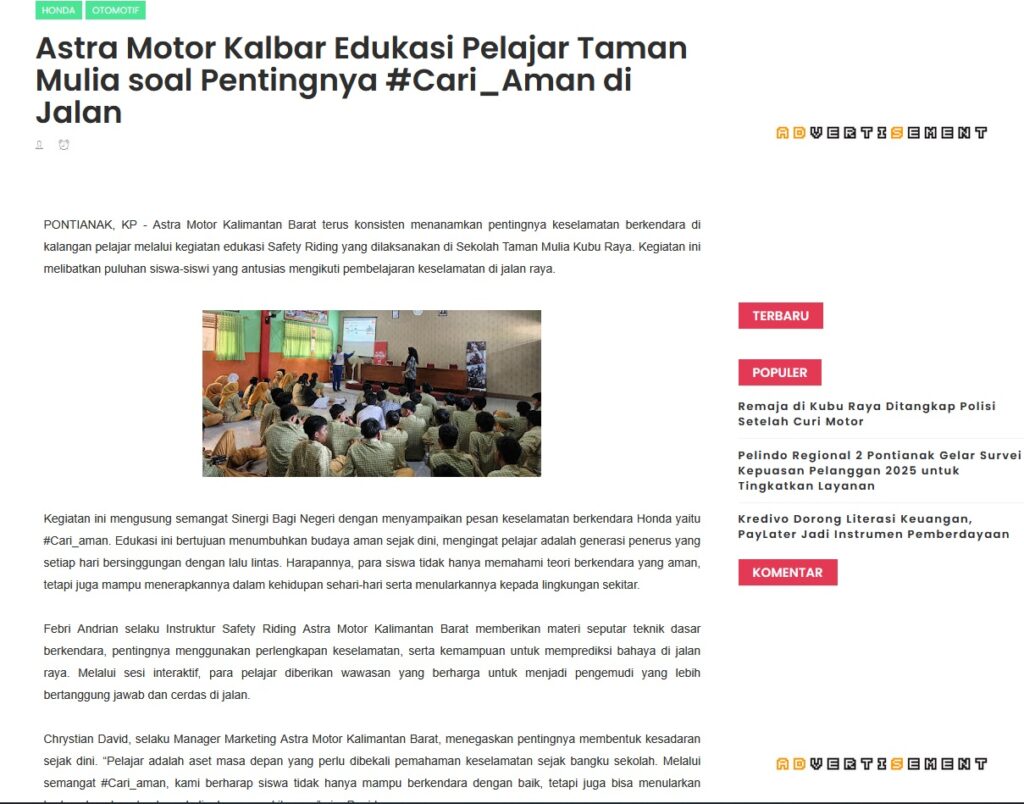 Astra Motor Kalbar Edukasi Pelajar Taman Mulia soal Pentingnya #Cari_Aman di Jalan by Muhammad Arif 15 September 2025 in Silahkan kunjungi https://www.kapuaspost.web.id/2025/09/astra-motor-kalbar-edukasi-pelajar.html. Tags: astra Astra Motor kalbar Astra Motor Pontianak astramotor honda kalbar pontianak sepeda motor You Might Like Regional Public Launching New ADV160 The SUV Pride Grand Launching New PCX 160 Truly Exceptional! Tetap hati-hati ya bro sist berkendara saat hujan.