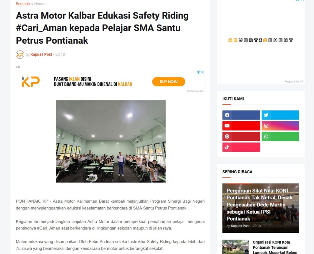 Astra Motor Kalbar Edukasi Safety Riding #Cari_Aman kepada Pelajar SMA Santu Petrus Pontianak by Muhammad Arif 21 Desember 2025 in Silahkan kunjungi https://www.kapuaspost.web.id/2025/12/astra-motor-kalbar-edukasi-safety_21.html. Tags: astra Astra Motor kalbar Astra Motor Pontianak astramotor honda kalbar pontianak sepeda motor You Might Like Regional Public Launching New ADV160 The SUV Pride Grand Launching New PCX 160 Truly Exceptional! Tetap hati-hati ya bro sist berkendara saat hujan.