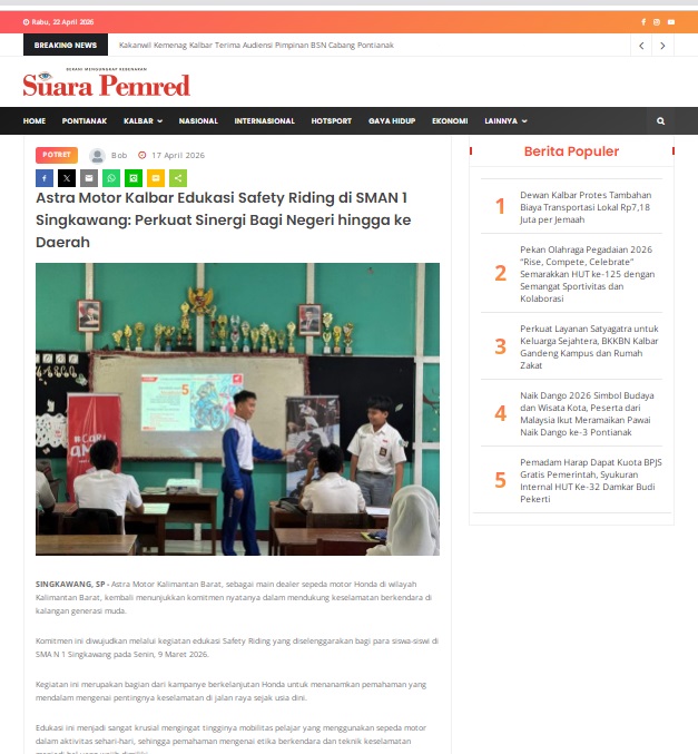 Astra Motor Kalbar Edukasi Safety Riding di SMAN 1 Singkawang: Perkuat Sinergi Bagi Negeri hingga ke Daerah by masmul 17 April 2026 in Silahkan kunjungi https://www.suarapemredkalbar.com/read/potret/17042026/astra-motor-kalbar-edukasi-safety-riding-di-sman-1-singkawang-perkuat-sinergi-bagi-negeri-hingga-ke-daerah. You Might Like Regional Public Launching New ADV160 The SUV Pride Grand Launching New PCX 160 Truly Exceptional! Tetap hati-hati ya bro sist berkendara saat hujan.