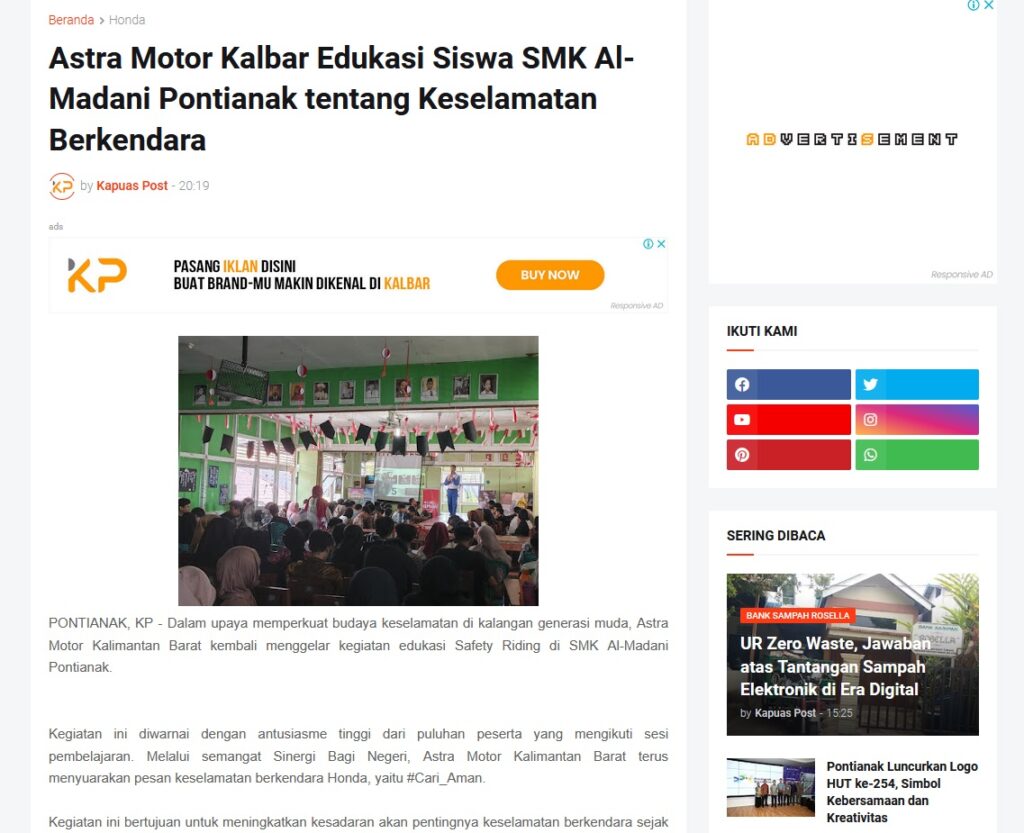 Astra Motor Kalbar Edukasi Siswa SMK Al-Madani Pontianak tentang Keselamatan Berkendara by Muhammad Arif 19 Oktober 2025 in Silahkan kunjungi https://www.kapuaspost.web.id/2025/10/astra-motor-kalbar-edukasi-siswa-smk-al.html. Tags: astra Astra Motor kalbar Astra Motor Pontianak astramotor honda kalbar pontianak sepeda motor You Might Like Regional Public Launching New ADV160 The SUV Pride Grand Launching New PCX 160 Truly Exceptional! Tetap hati-hati ya bro sist berkendara saat hujan.