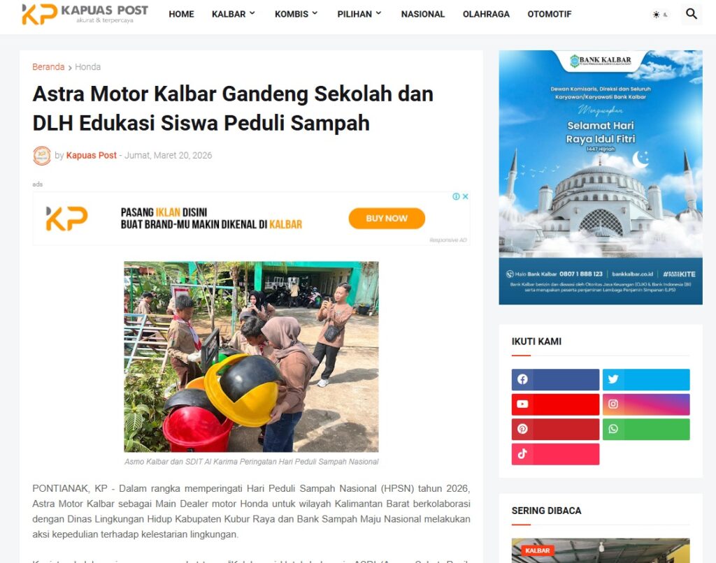 Astra Motor Kalbar Gandeng Sekolah dan DLH Edukasi Siswa Peduli Sampah by Muhammad Arif 20 Maret 2026 in Silahkan kunjungi https://www.kapuaspost.web.id/2026/03/astra-motor-kalbar-gandeng-sekolah-dan.html. Tags: astra Astra Motor kalbar Astra Motor Pontianak astramotor honda kalbar pontianak sepeda motor You Might Like Regional Public Launching New ADV160 The SUV Pride Grand Launching New PCX 160 Truly Exceptional! Tetap hati-hati ya bro sist berkendara saat hujan.
