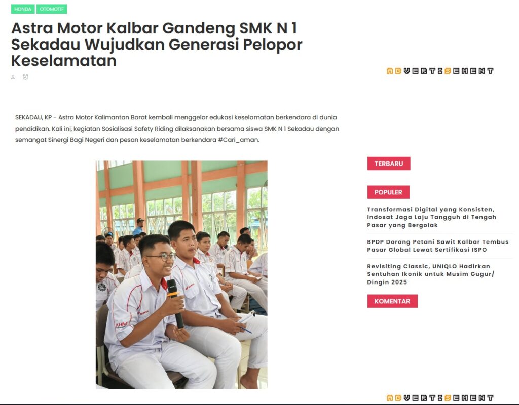 Astra Motor Kalbar Gandeng SMK N 1 Sekadau Wujudkan Generasi Pelopor Keselamatan by Muhammad Arif 22 Agustus 2025 in Silahkan kunjungi https://www.kapuaspost.web.id/2025/08/astra-motor-kalbar-gandeng-smk-n-1.html. Tags: astra Astra Motor kalbar Astra Motor Pontianak astramotor honda kalbar pontianak sepeda motor You Might Like Regional Public Launching New ADV160 The SUV Pride Grand Launching New PCX 160 Truly Exceptional! Tetap hati-hati ya bro sist berkendara saat hujan.