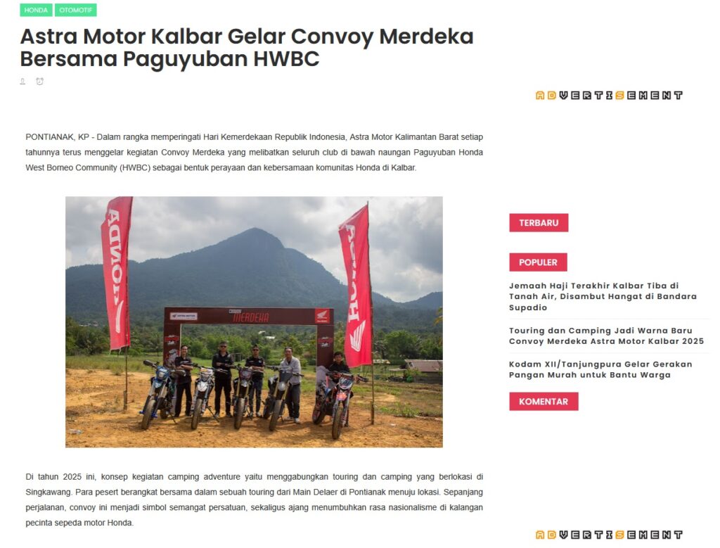 Astra Motor Kalbar Gelar Convoy Merdeka Bersama Paguyuban HWBC by Muhammad Arif 3 September 2025 in Silahkan kunjungi https://www.kapuaspost.web.id/2025/09/astra-motor-kalbar-gelar-convoy-merdeka.html. Tags: astra Astra Motor kalbar Astra Motor Pontianak astramotor honda kalbar pontianak sepeda motor You Might Like Regional Public Launching New ADV160 The SUV Pride Grand Launching New PCX 160 Truly Exceptional! Tetap hati-hati ya bro sist berkendara saat hujan.