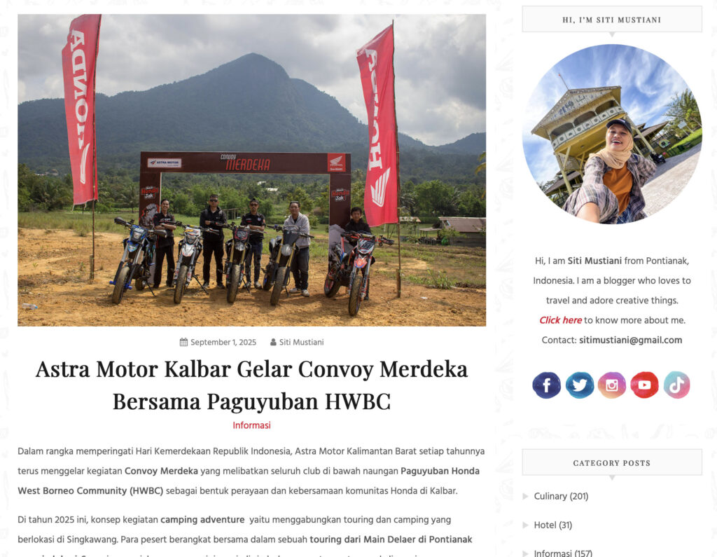 Astra Motor Kalbar Gelar Convoy Merdeka Bersama Paguyuban HWBC by Siti Mustiani 2 September 2025 in Silahkan kunjungi https://sitimustiani.com/2025/09/astra-motor-kalbar-gelar-convoy-merdeka-bersama-paguyuban-hwbc/. Tags: Astra Motor Kalimantan Barat Camping Adventure Convoy Convoy Merdeka Honda Kalbar Honda West Borneo Community HWBC Paguyuban Honda West Borneo Community Siti Mustiani http://www.sitimustiani.com Love to travel and adore creative things ✨ You Might Like Regional Public Launching New ADV160 The SUV Pride Grand Launching New PCX 160 Truly Exceptional! Tetap hati-hati ya bro sist berkendara saat hujan.