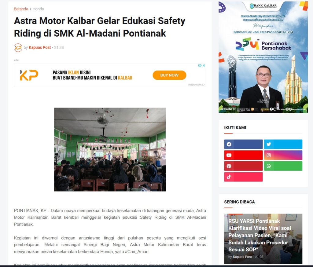 Astra Motor Kalbar Gelar Edukasi Safety Riding di SMK Al-Madani Pontianak by Muhammad Arif 27 Oktober 2025 in Silahkan kunjungi https://www.kapuaspost.web.id/2025/10/astra-motor-kalbar-gelar-edukasi-safety.html. Tags: astra Astra Motor kalbar Astra Motor Pontianak astramotor honda kalbar pontianak sepeda motor You Might Like Regional Public Launching New ADV160 The SUV Pride Grand Launching New PCX 160 Truly Exceptional! Tetap hati-hati ya bro sist berkendara saat hujan.