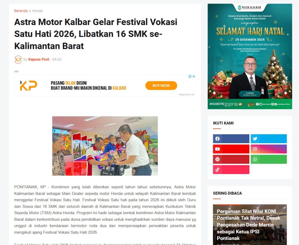 Astra Motor Kalbar Gelar Festival Vokasi Satu Hati 2026, Libatkan 16 SMK se-Kalimantan Barat by Muhammad Arif 29 Desember 2025 in Silahkan kunjungi https://www.kapuaspost.web.id/2025/12/astra-motor-kalbar-gelar-festival_29.html. Tags: astra Astra Motor kalbar Astra Motor Pontianak astramotor honda kalbar pontianak sepeda motor You Might Like Regional Public Launching New ADV160 The SUV Pride Grand Launching New PCX 160 Truly Exceptional! Tetap hati-hati ya bro sist berkendara saat hujan.
