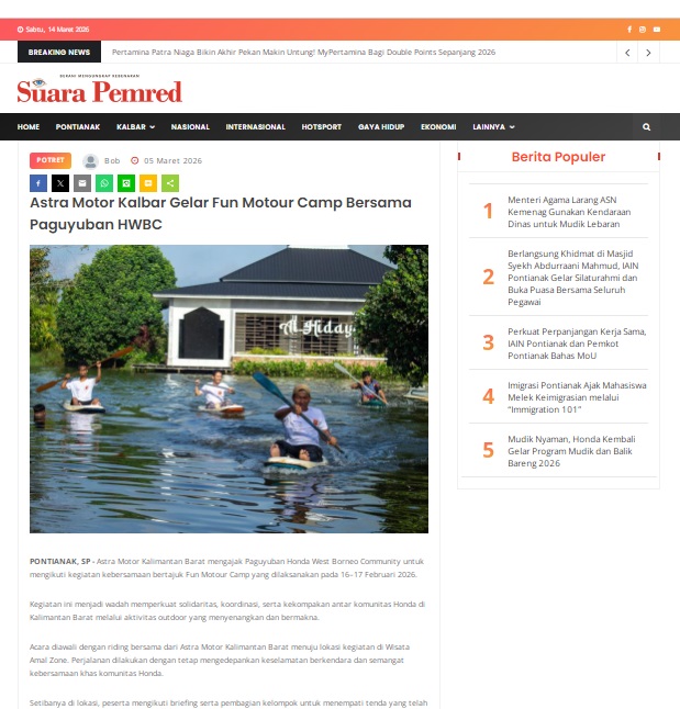 Astra Motor Kalbar Gelar Fun Motour Camp Bersama Paguyuban HWBC by masmul 5 Maret 2026 in Silahkan kunjungi https://www.suarapemredkalbar.com/read/potret/05032026/astra-motor-kalbar-gelar-fun-motour-camp-bersama-paguyuban-hwbc. You Might Like Regional Public Launching New ADV160 The SUV Pride Grand Launching New PCX 160 Truly Exceptional! Tetap hati-hati ya bro sist berkendara saat hujan.
