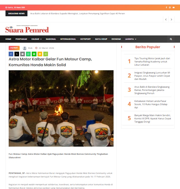 Astra Motor Kalbar Gelar Fun Motour Camp, Komunitas Honda Makin Solid by masmul 22 Maret 2026 in Silahkan kunjungi https://www.suarapemredkalbar.com/read/potret/22032026/astra-motor-kalbar-gelar-fun-motour-camp-komunitas-honda-makin-solid. You Might Like Regional Public Launching New ADV160 The SUV Pride Grand Launching New PCX 160 Truly Exceptional! Tetap hati-hati ya bro sist berkendara saat hujan.