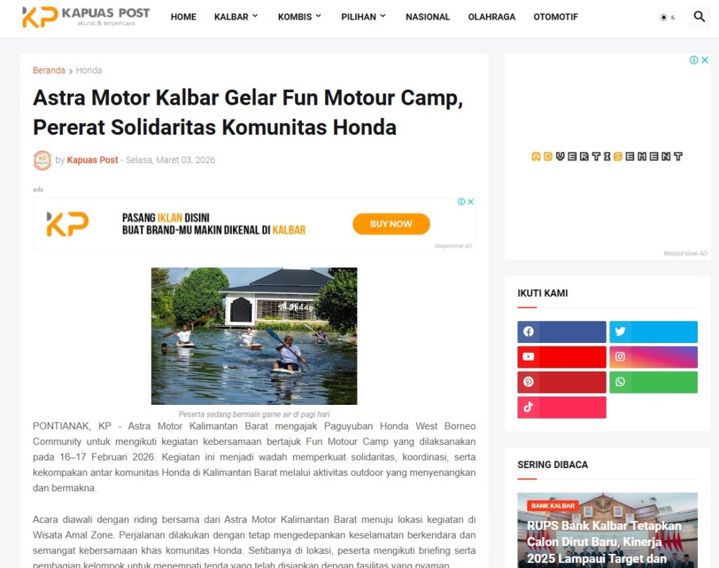 Astra Motor Kalbar Gelar Fun Motour Camp, Pererat Solidaritas Komunitas Honda by Muhammad Arif 3 Maret 2026 in Silahkan kunjungi https://www.kapuaspost.web.id/2026/03/astra-motor-kalbar-gelar-fun-motour.html. Tags: astra Astra Motor kalbar Astra Motor Pontianak astramotor honda kalbar pontianak sepeda motor You Might Like Regional Public Launching New ADV160 The SUV Pride Grand Launching New PCX 160 Truly Exceptional! Tetap hati-hati ya bro sist berkendara saat hujan.