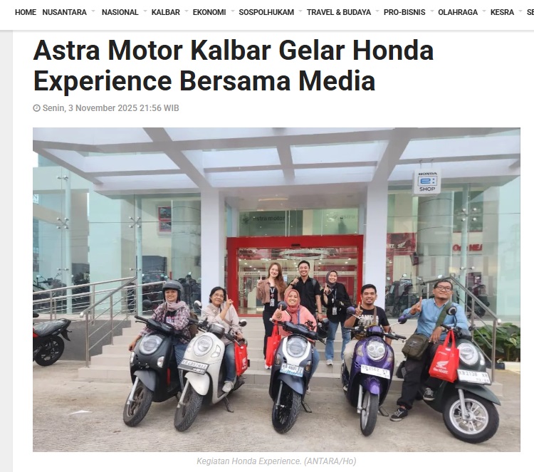 Astra Motor Kalbar Gelar Honda Experience Bersama Media by Dedi 3 November 2025 in Silahkan kunjungi https://kalbar.antaranews.com/berita/672225/astra-motor-kalbar-gelar-honda-experience-bersama-media. You Might Like Regional Public Launching New ADV160 The SUV Pride Grand Launching New PCX 160 Truly Exceptional! Tetap hati-hati ya bro sist berkendara saat hujan.