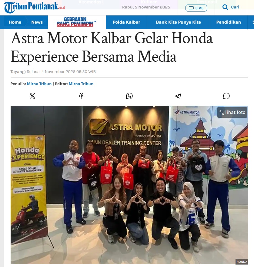 Astra Motor Kalbar Gelar Honda Experience Bersama Media by Ishak Ismail 4 November 2025 in Silahkan kunjungi https://pontianak.tribunnews.com/otomotif/1148550/astra-motor-kalbar-gelar-honda-experience-bersama-media. You Might Like Regional Public Launching New ADV160 The SUV Pride Grand Launching New PCX 160 Truly Exceptional! Tetap hati-hati ya bro sist berkendara saat hujan.