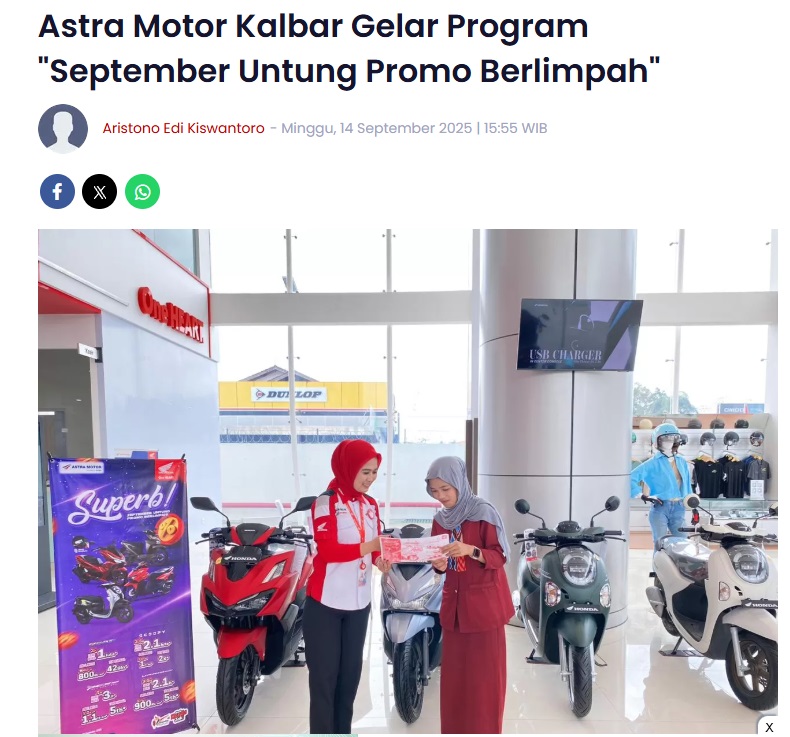 Astra Motor Kalbar Gelar Program “September Untung Promo Berlimpah” by Aristono Edi Kiswantoro 14 September 2025 in Silahkan kunjungi https://pontianakpost.jawapos.com/pro-bisnis/1466570095/astra-motor-kalbar-gelar-program-september-un. You Might Like Regional Public Launching New ADV160 The SUV Pride Grand Launching New PCX 160 Truly Exceptional! Tetap hati-hati ya bro sist berkendara saat hujan.