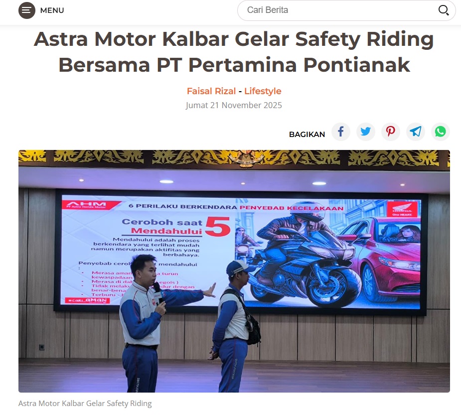 Astra Motor Kalbar Gelar Safety Riding Bersama PT Pertamina Pontianak by Dodi Dodi 21 November 2025 in Silahkan kunjungi https://harianberkat.com/2025/11/21/astra-motor-kalbar-gelar-safety-riding-bersama-pt-pertamina-pontianak/. You Might Like Regional Public Launching New ADV160 The SUV Pride Grand Launching New PCX 160 Truly Exceptional! Tetap hati-hati ya bro sist berkendara saat hujan.