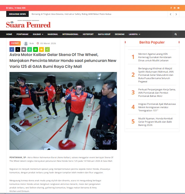Astra Motor Kalbar Gelar Skena Of The Wheel, Manjakan Pencinta Motor Honda saat peluncuran New Vario 125 di GAIA Bumi Raya City Mall by masmul 5 Maret 2026 in Silahkan kunjungi https://www.suarapemredkalbar.com/read/potret/05032026/astra-motor-kalbar-gelar-skena-of-the-wheel-manjakan-pencinta-motor-honda-saat-peluncuran-new-vario-125-di-gaia-bumi-raya-city-mall. You Might Like Regional Public Launching New ADV160 The SUV Pride Grand Launching New PCX 160 Truly Exceptional! Tetap hati-hati ya bro sist berkendara saat hujan.