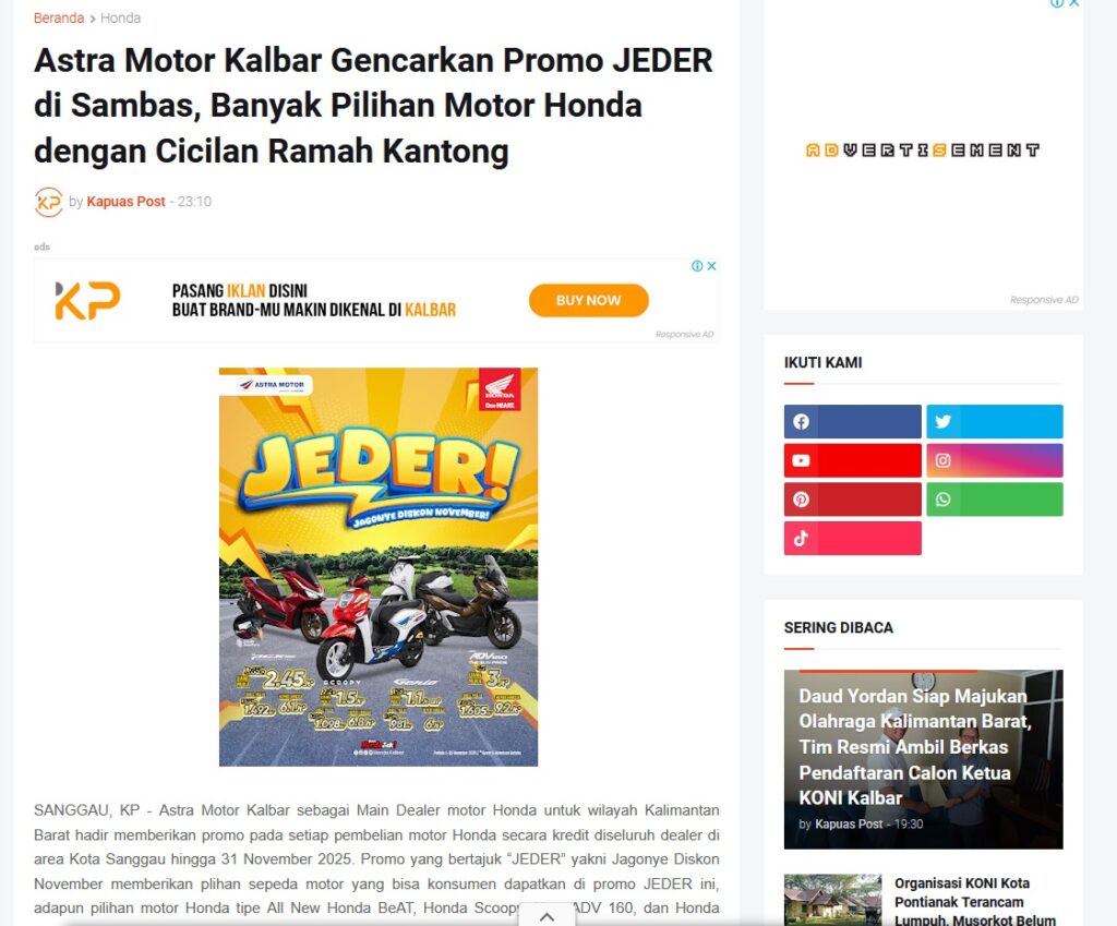Astra Motor Kalbar Gencarkan Promo JEDER di Sambas, Banyak Pilihan Motor Honda dengan Cicilan Ramah Kantong by Muhammad Arif 21 November 2025 in Silahkan kunjungi https://www.kapuaspost.web.id/2025/11/astra-motor-kalbar-gencarkan-promo.html. Tags: astra Astra Motor kalbar Astra Motor Pontianak astramotor honda kalbar pontianak sepeda motor You Might Like Regional Public Launching New ADV160 The SUV Pride Grand Launching New PCX 160 Truly Exceptional! Tetap hati-hati ya bro sist berkendara saat hujan.