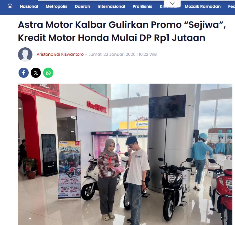 Astra Motor Kalbar Gulirkan Promo “Sejiwa”, Kredit Motor Honda Mulai DP Rp1 Jutaan by Aristono Edi Kiswantoro 23 Januari 2026 in Silahkan kunjungi https://pontianakpost.jawapos.com/pro-bisnis/1467101855/astra-motor-kalbar-gulirkan-promo-sejiwa-kredit-motor-honda-mulai-dp-rp1-jutaan. You Might Like Regional Public Launching New ADV160 The SUV Pride Grand Launching New PCX 160 Truly Exceptional! Tetap hati-hati ya bro sist berkendara saat hujan.