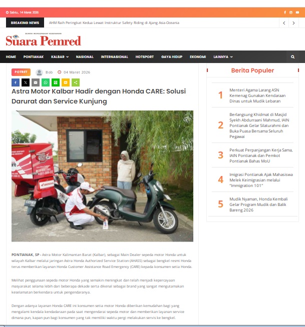Astra Motor Kalbar Hadir dengan Honda CARE: Solusi Darurat dan Service Kunjung by masmul 4 Maret 2026 in Silahkan kunjungi https://www.suarapemredkalbar.com/read/potret/04032026/astra-motor-kalbar-hadir-dengan-honda-care-solusi-darurat-dan-service-kunjung. You Might Like Regional Public Launching New ADV160 The SUV Pride Grand Launching New PCX 160 Truly Exceptional! Tetap hati-hati ya bro sist berkendara saat hujan.
