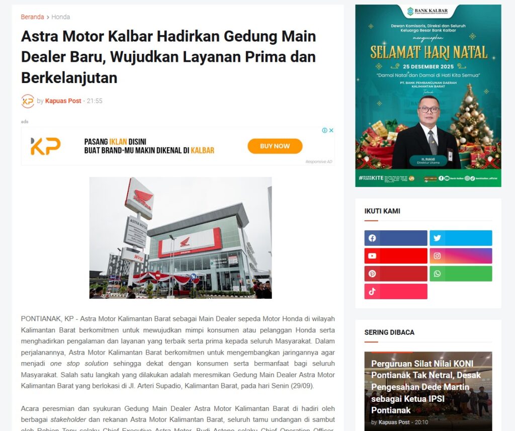 Astra Motor Kalbar Hadirkan Gedung Main Dealer Baru, Wujudkan Layanan Prima dan Berkelanjutan by Muhammad Arif 24 Desember 2025 in Silahkan kunjungi https://www.kapuaspost.web.id/2025/12/astra-motor-kalbar-hadirkan-gedung-main.html. Tags: astra Astra Motor kalbar Astra Motor Pontianak astramotor honda kalbar pontianak sepeda motor You Might Like Regional Public Launching New ADV160 The SUV Pride Grand Launching New PCX 160 Truly Exceptional! Tetap hati-hati ya bro sist berkendara saat hujan.