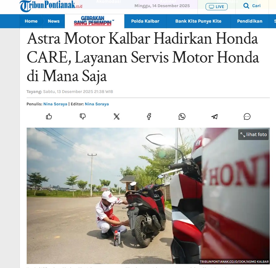 Astra Motor Kalbar Hadirkan Honda CARE, Layanan Servis Motor Honda di Mana Saja by Nina Soraya 13 Desember 2025 in Silahkan kunjungi https://pontianak.tribunnews.com/otomotif/1154183/astra-motor-kalbar-hadirkan-honda-care-layanan-servis-motor-honda-di-mana-saja. You Might Like Regional Public Launching New ADV160 The SUV Pride Grand Launching New PCX 160 Truly Exceptional! Tetap hati-hati ya bro sist berkendara saat hujan.